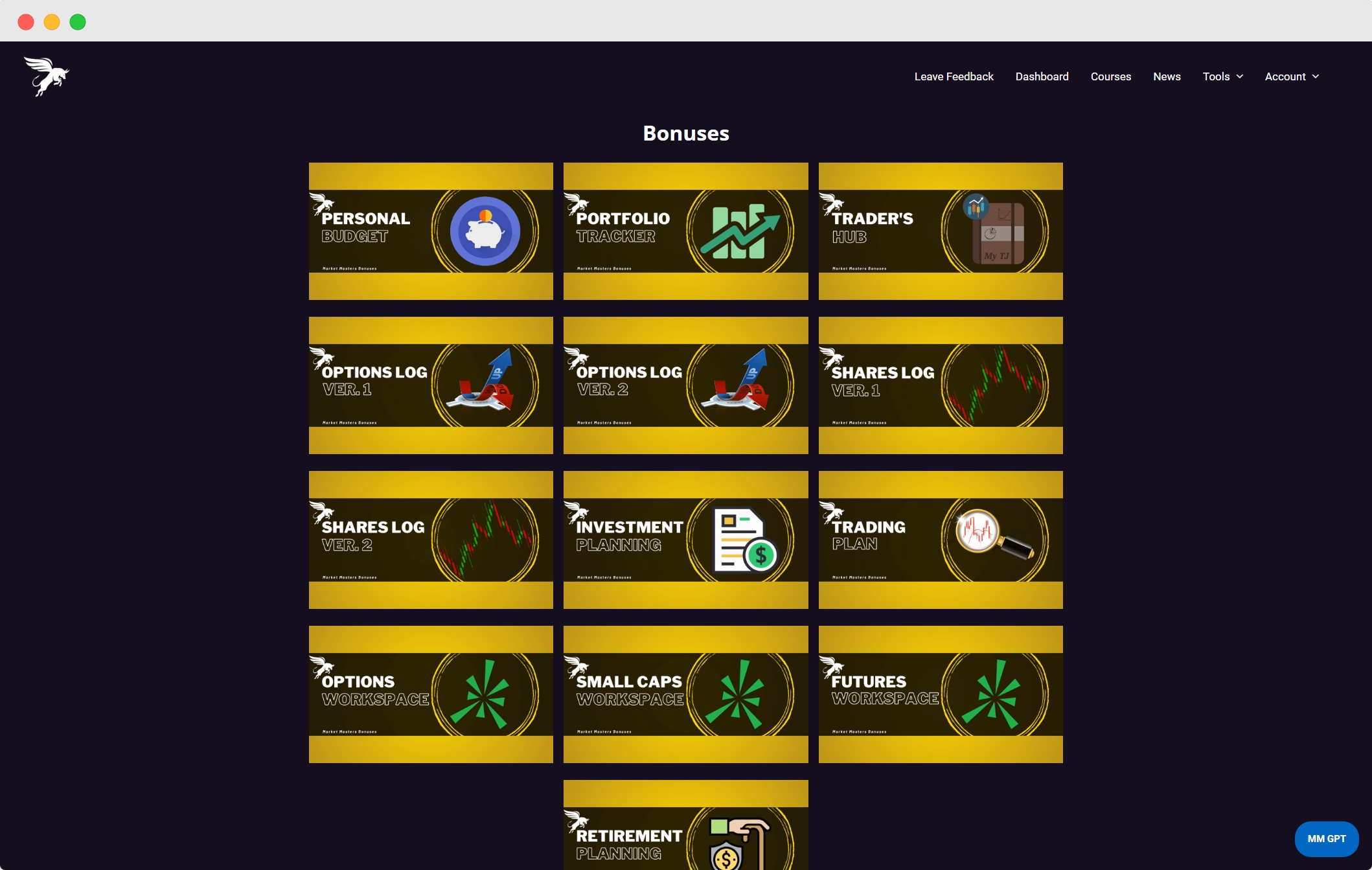 13 Bonus items that can benefit your trading journey. This includes a variety of items, including a personal budget, portfolio tracker, trading logs, and Thinkorswim workspaces. Feel free to click on any individual bonus, and it will redirect you to it.