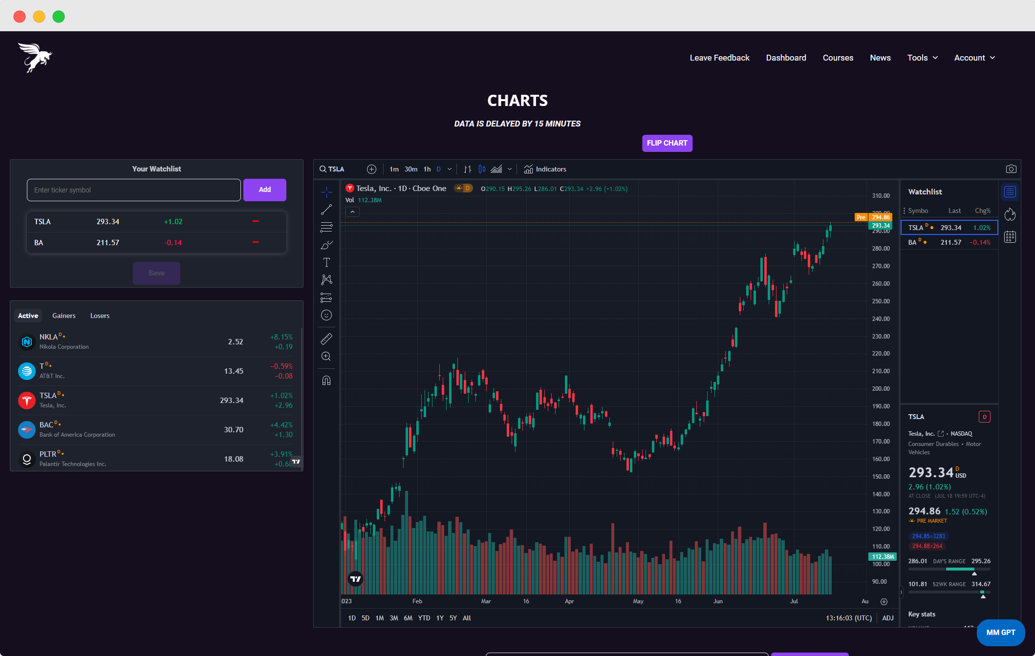 You will notice multiple features on the Charts page: Your personal watchlist, top gainers, losers, and active stocks, and a personalized Tradingview charting feature. You also have the ability to “Flip Chart” which may help you when doing technical analysis. Please note that data is currently delayed by 15 minutes.