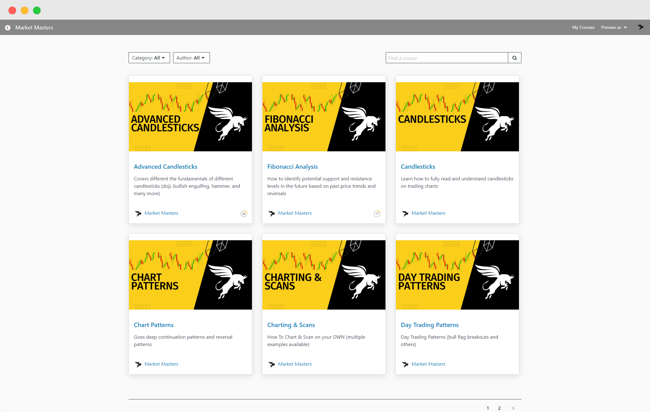 A comprehensive curriculum that covers aspects of technical, fundamental, and market analysis, ensures you have a well-rounded foundation for success when trading. Clicking on the Courses tab will lead you to a variety of topics listed in the aforementioned and are accompanied with short descriptions that describe what the categories will cover. As you complete the videos, you will notice a progress bar begin to fill up, and the closer you are to completing a category, the closer it will get to 100%.